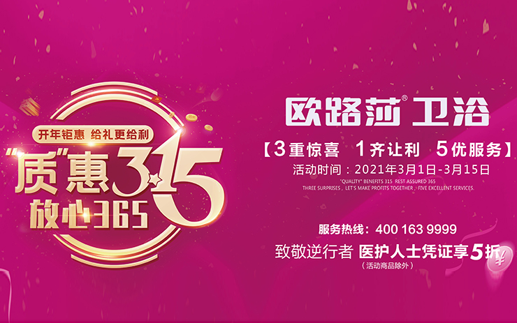 “質(zhì)”惠315 放心365 | 歐路莎衛(wèi)浴開年大促火熱開啟!3月1日-3月15日,歐路莎衛(wèi)浴開年第一戰(zhàn),我們嚴(yán)陣以待,火力全開,做到讓消費(fèi)者花最少的錢,買最好的東西!MORE -