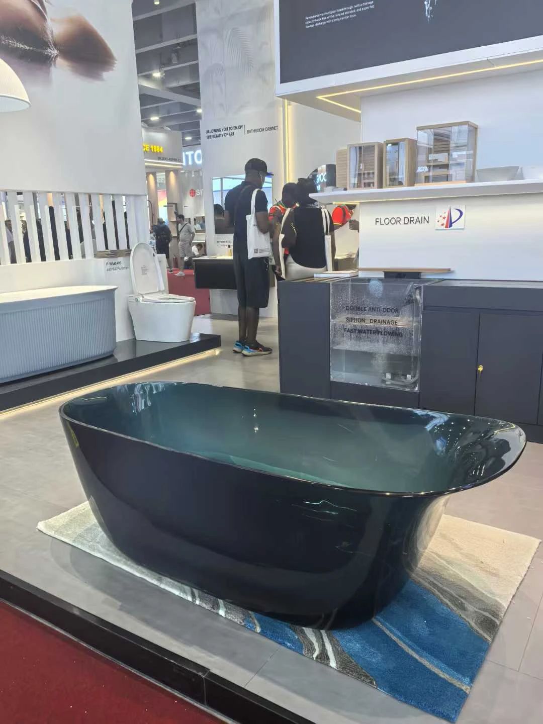 在展館正前方,一款透明漸變的浴缸無(wú)疑是獨(dú)特的存在。它采用環(huán)保樹(shù)脂打造,質(zhì)地輕盈卻堅(jiān)固耐用,抗沖擊、防刮擦,長(zhǎng)久使用依然晶瑩如新。獨(dú)特的漸變色在光線(xiàn)折射下呈現(xiàn)夢(mèng)幻般的光影效果,讓浴室瞬間升級(jí)為高級(jí)水療空間。