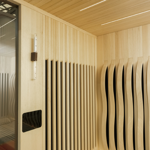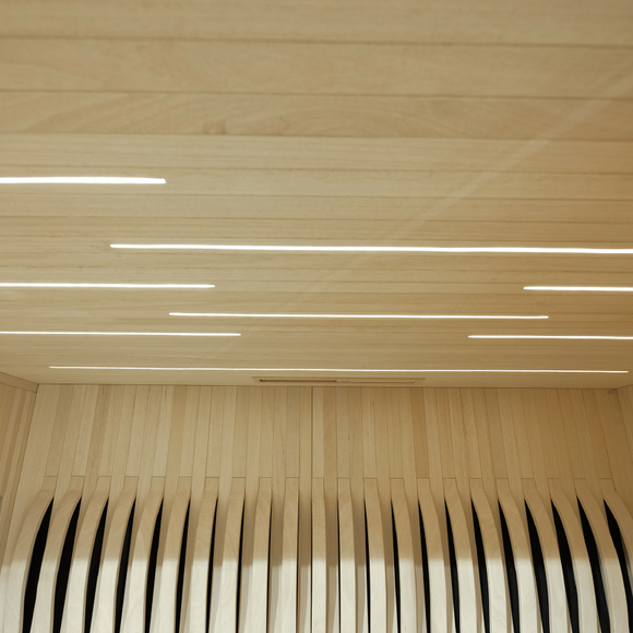 雙彩屏觸控智能系統(含藍牙音樂、收音、臭氧消毒、智能APP等)、遠紅外汗蒸系統衣掛、坐凳、彩色氛圍燈系統、一體式發熱板、底部防撞夜燈、靠背、造景墻、置物板、枕頭、躺位臀部加熱系統(可單獨控制) 、 沙漏、度計、木桶、木勺、桑拿石、瑞典TYLO原裝進口6.0KW干蒸爐。