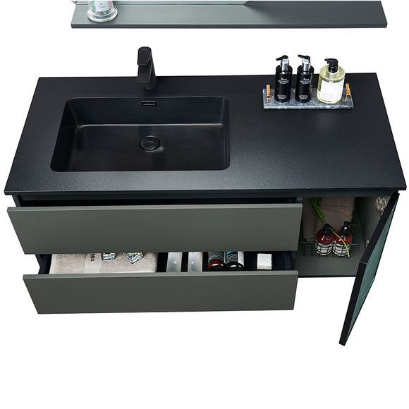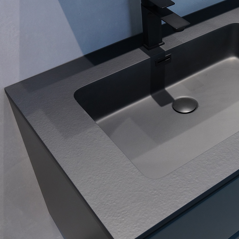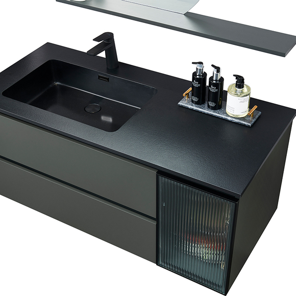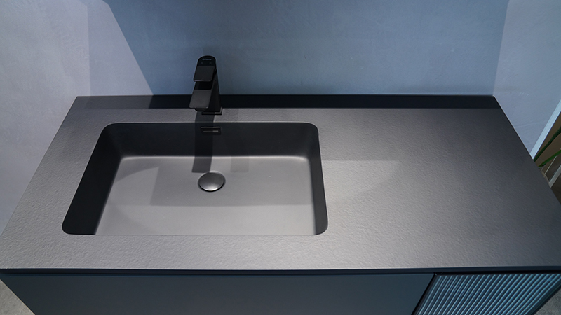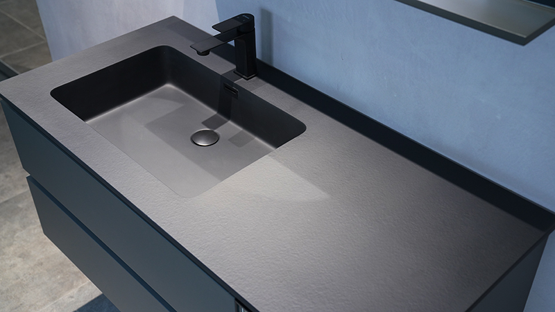 微晶石一體成型的黑色臺盆,臺面黑色火燒石紋理,盆芯亮光,持久耐用。